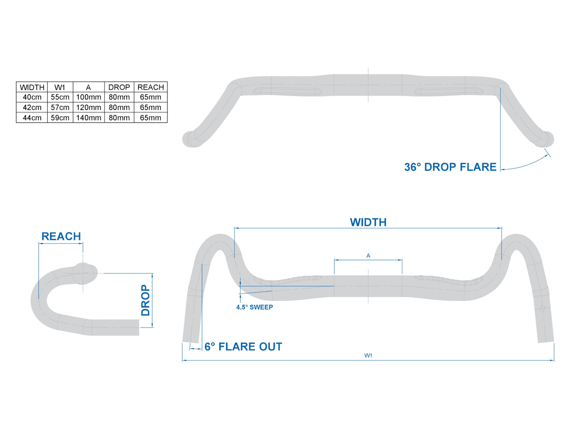 | Dropbar Shape | Drop < 130mm (compact), Reach ≥ 80mm, Ergo (Curve with alternating radius), Center section with Backsweep, Flare / bent out Drops |