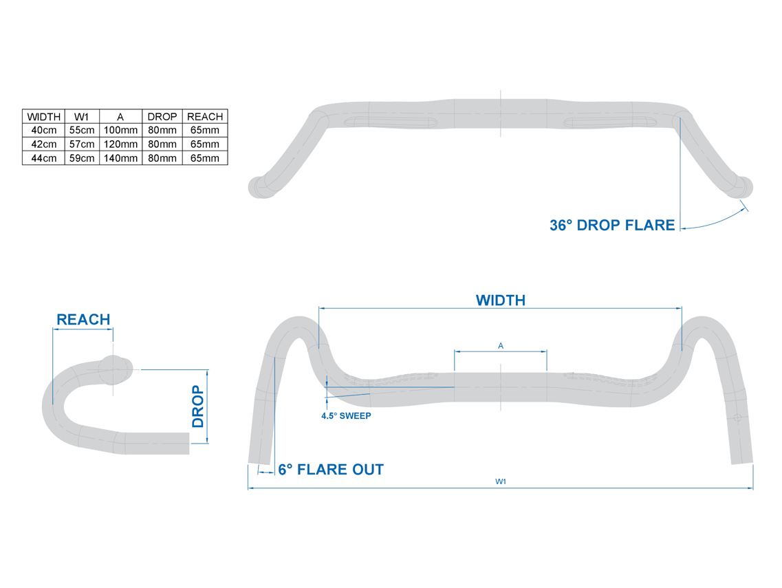 | Dropbar Shape | Drop < 130mm (compact), Reach < 80mm, Ergo (Curve with alternating radius), Center section with Backsweep, Flare / bent out Drops |