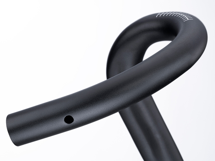 A new variable radius drop, matching the carbon SL-70 Ergo, allows for multiple hand positions when riding in the drops. This provides comfortable hand positions for riders who like to reach down to the drops, as well as for riders who reach in. The ergonomic flat top now has a 3° backsweep for wrist comfort. A 10° ramp angle provides a perfect transition from bars to hoods, and sizes 40cm and up are clip-on compatible. The bar is also drilled to be Di2 RS910 junction compatible, and is available in a Bead Blast Black finish with white logos.